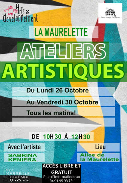 Ateliers artistiques : Du lundi 26 octobre au vendredi 30 octobre tous les matins de 10h30 à 12h30, allée de La Maurelette... Lire la suite